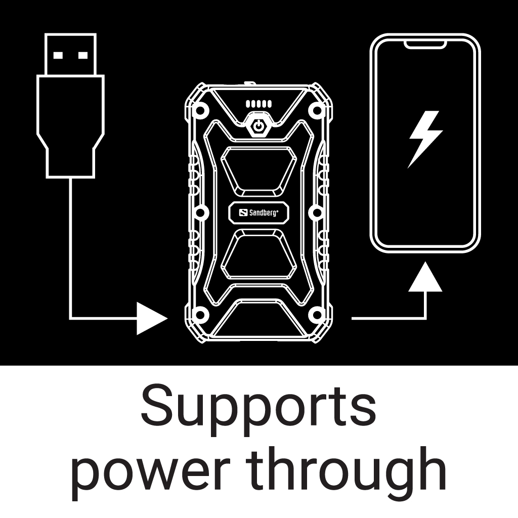 Sandberg Survivor Powerbank 27000 PD65W is the ultimate backup battery for recharging mobiles, laptops and other mobile devices. Packed in a robust IP66-certified shell, this powerbank can really tolerate some rough treatment. It's completely water, impact and dust-resistant, letting you take it with you almost anywhere. With 2 powerful USB outlets, including QC 3.0 support for 18W. There is also a USB-C jack to charge USB-C devices right up to 65W, providing enough current for most laptop models. On the back, there is a powerful torch with no fewer than 120 lumen.