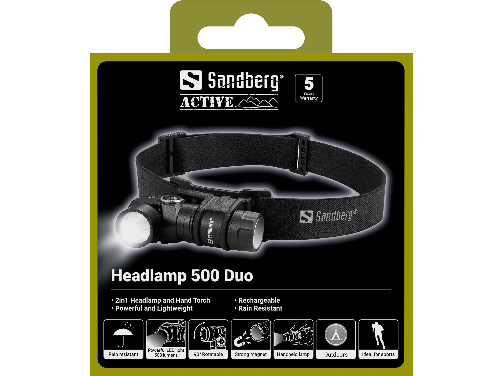 Sandberg Headlamp 500 Duo è il tuo compagno flessibile nel buio. La testa girevole della lampada ti permette di usarla sia come lampada frontale che come torcia portatile, perfetta quando hai bisogno di entrambe le mani libere e di una fonte di luce portatile. Con una batteria ricaricabile e una luce LED da 500 Lumen, hai sempre un'illuminazione affidabile a portata di mano. La lampada ha 5 impostazioni di luce e l'opzione per la luce rossa, mentre la fascia leggera offre una vestibilità comoda durante l'uso prolungato. La costruzione resistente all'acqua IPX4 la rende perfetta per lavori all'aperto, campeggio o corsa sotto una pioggia leggera. Ricaricala tramite USB e sii pronto per qualsiasi avventura.